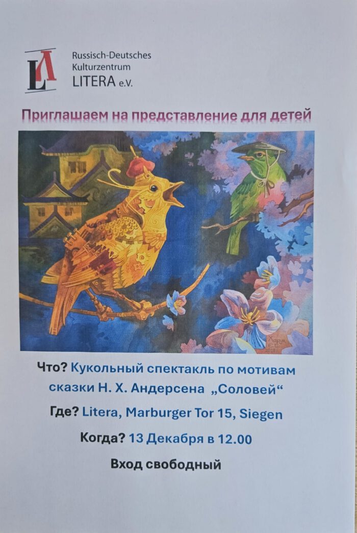 Am 13.12.2025 um 12 Uhr wird, bei Litera (Marburger Tor 15), das Puppentheaterstück zum Märchen ‚Die Nachtigall‘ von Andersen aufgeführt.